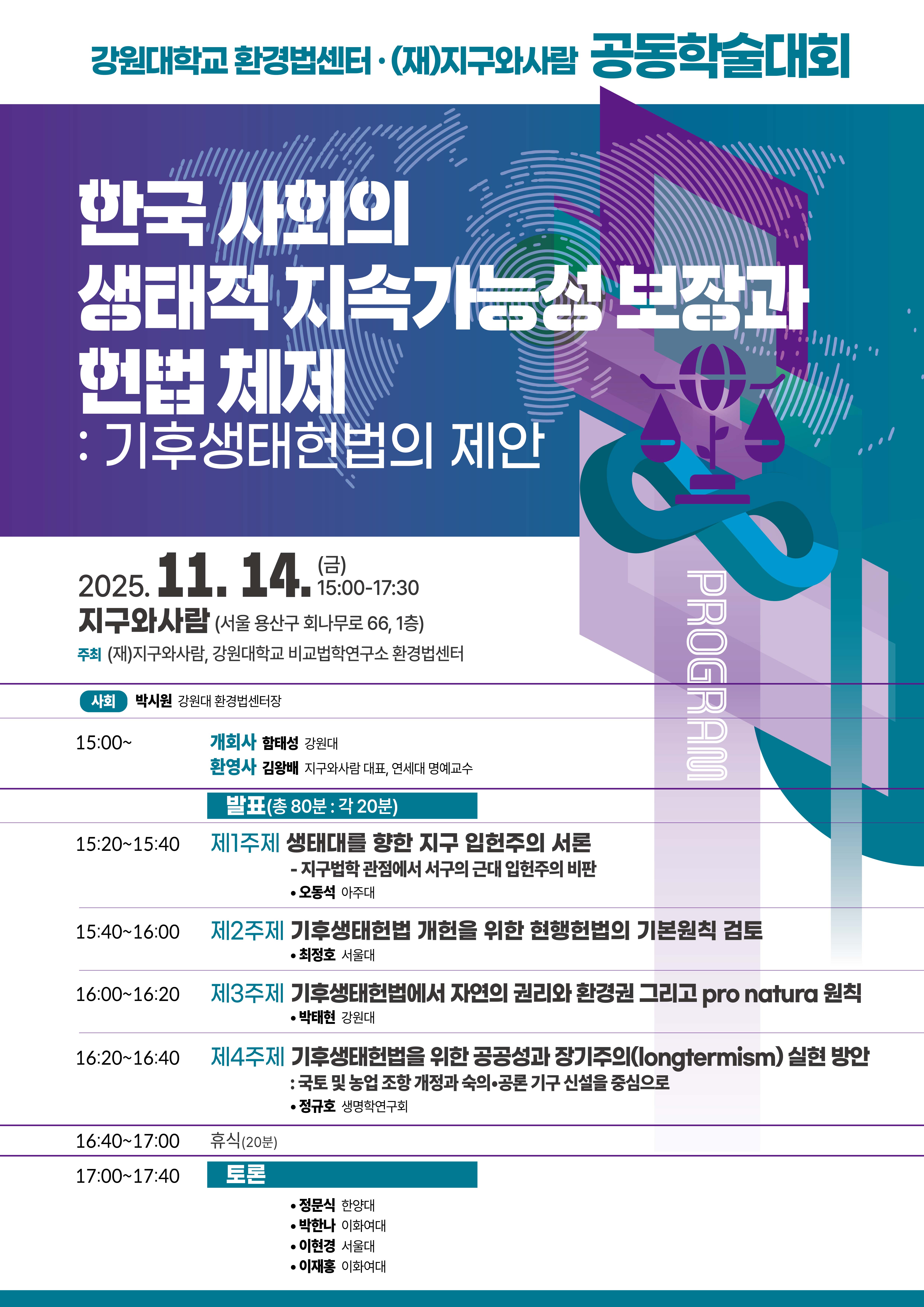 ❍ 주최: 강원대학교 환경법센터, (재)지구와사람 ❍ 일시: 2025.11.14. 금요일 15:00-17:30❍ 장소: 지구와사람(서울 용산구 회나무로 66, 1층) & 온라인(Zoom)